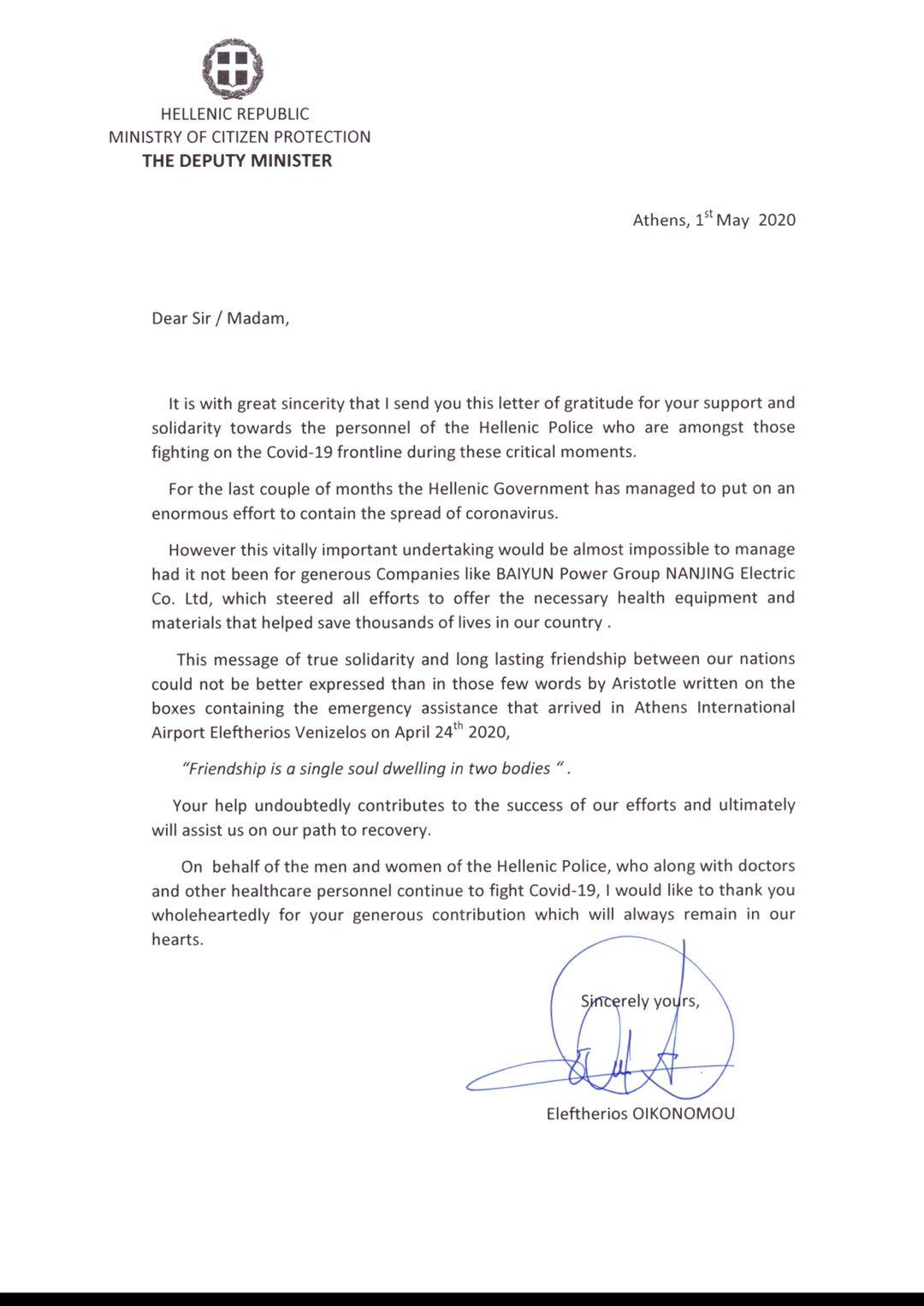 2020年5月1日,希臘共和國公民保護(hù)部副部長Eleftherios OIKONOMOU先生于雅典向南京電氣發(fā)出感謝信,對南京電氣在新冠肺炎疫情防控中對希臘安全與警察部門及時(shí)提供支持幫助表示感謝。 感謝信說,作為在抗擊...