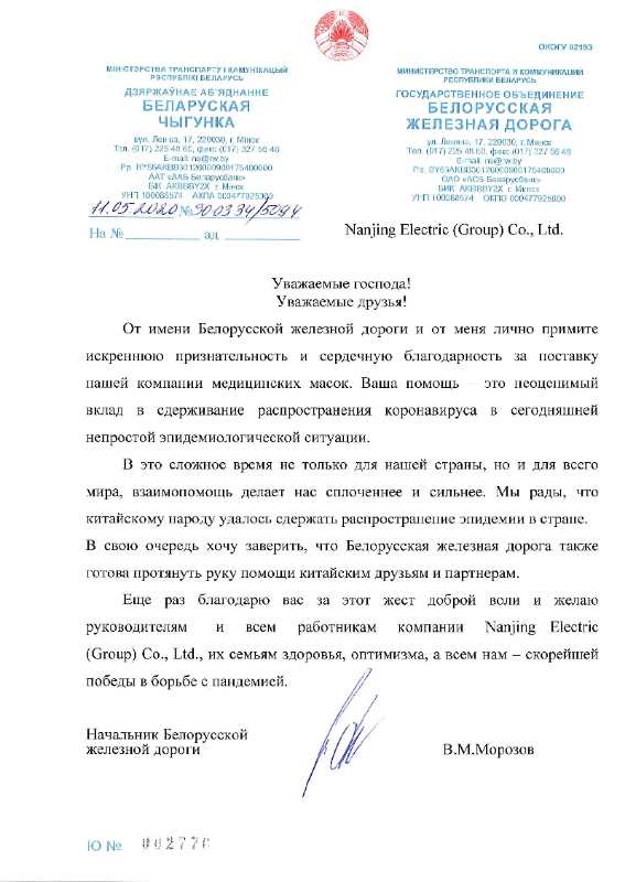2020年5月11日,白俄羅斯鐵路長官弗拉基米爾•莫洛佐夫先生代表白俄羅斯鐵路部門,向南京電氣發(fā)出感謝信,對南京電氣向白俄羅斯鐵路局提供防疫物資支援表示感謝。 感謝信說,在當(dāng)今疫情防控特殊時(shí)期,...