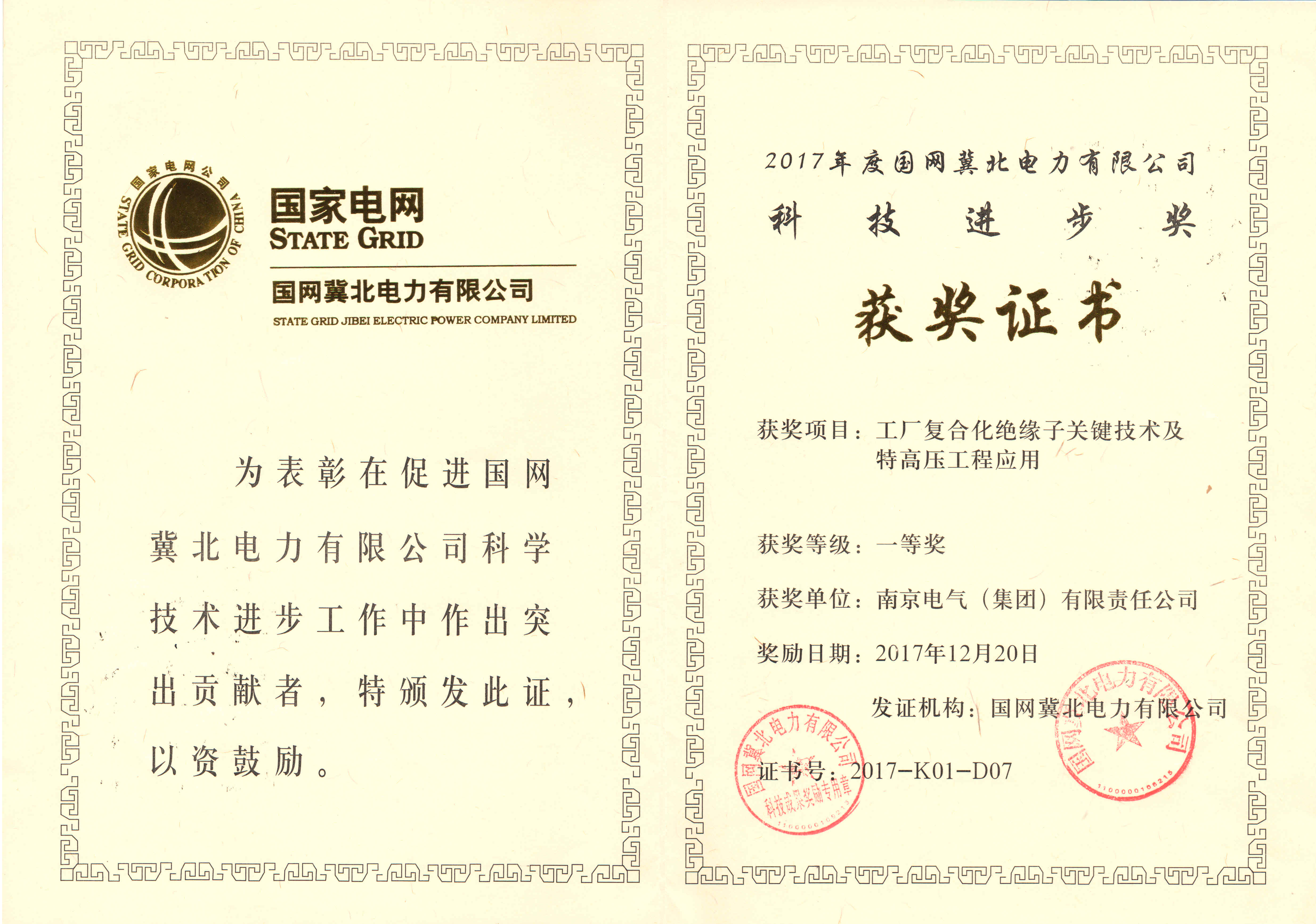 南京電氣獲國網(wǎng)冀北電力科技進(jìn)步一等獎