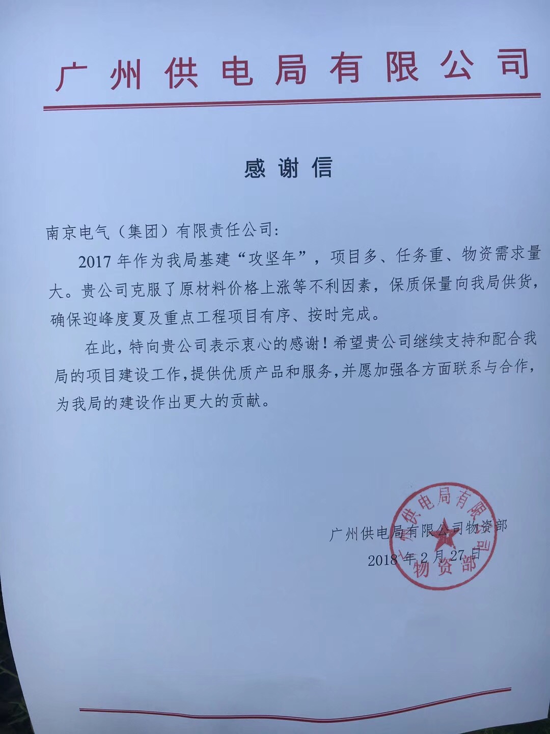 廣州供電局有限公司近日向南京電氣(集團(tuán))有限責(zé)任公司發(fā)來感謝信,對南京電氣去年保質(zhì)保量向該局供貨、確保迎峰度夏及重點工程項目按時完成表示感謝。 感謝信說,2017年作為我局基建“攻堅年&...
